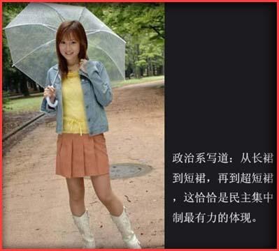 2006年夏季,北大特别风行超短裙。校领导认为极不雅观,贴出布告准备严厉禁止。谁知“禁止布告”在三角地的布告栏里一贴出,就迎来了许多学生的“批判”: