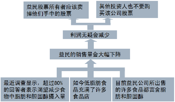在最近的一份调查中,超过80%的回答者表示渴望减少食物中脂肪和胆固醇的摄入量。如今,低脂肪食品已经充满了许多食品店。目前,由于益民公司所出售的许多食品都富含脂肪和胆固醇,该公司的销售量可能会大幅度下降,利润也无疑会减少。因此建议持有益民股票的所有者应该卖掉他们手中的股票,同时其他投资人也不要购买该公司的股票。