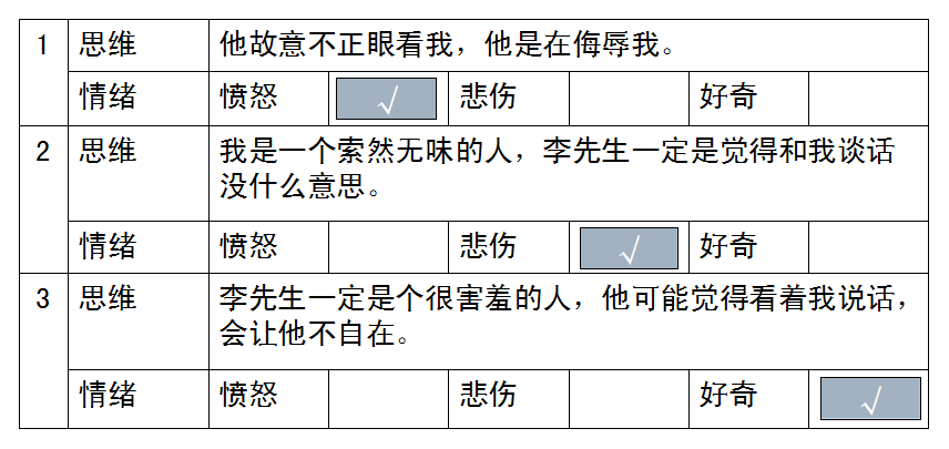 因此,为了帮助你更加清晰地认识和把握自己的思维,你这次回去之后,还希望你继续回忆至少三种不同的情景,并且记录下你当时的情绪和不自主思维,然后把它填写在上述空白的表格里。--心理咨询师以此结束了这第一次的咨询。