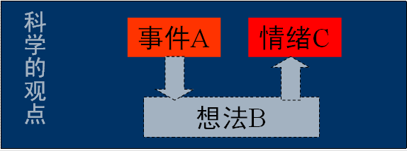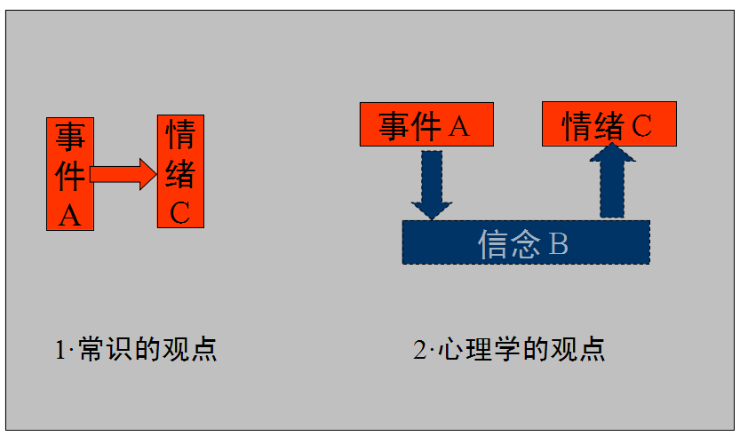 “虽然日常生活中通常人们会认为,自己的情绪反应作为对某个事件反应的结果C(Consequence)是直接由诱发性事件A(Activating event)引起的,即A引起了C,但是,上述例子说明了,人的情绪其实不仅仅是由事件A本身所引起的,而主要是由经历这一事件的人对这一事件的看法、解释、信念B(Believe)所引起的,事件A只是引起情绪及行为反应的间接原因,而信念B(Believe)才是更直接的原因。这就是现代心理学中的著名的ABC理论。”