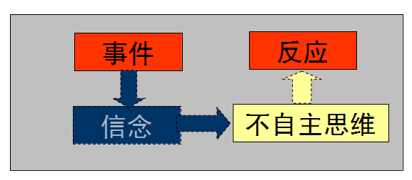 当然,引起你的某种特定情绪的思维并不一定就是你有计划的、主观故意的思维,而很可能是一种原先被深藏的信念、此刻不由自主地被激活和涌现在你的脑海里的想法--心理学上把这种想法称之为“不自主思维”。这样就可以进一步得到下图: