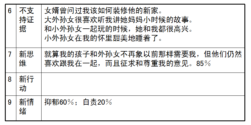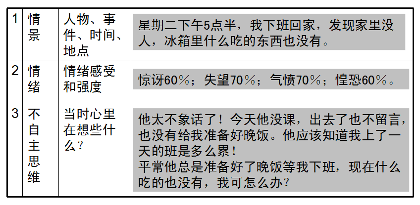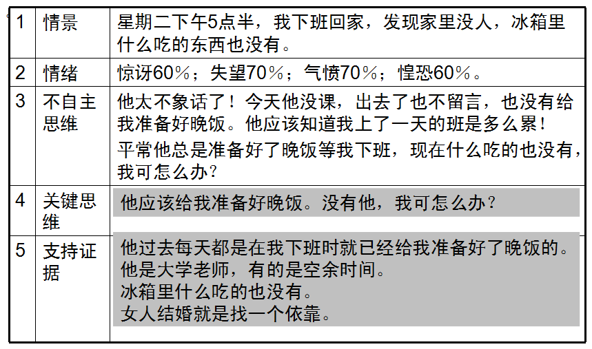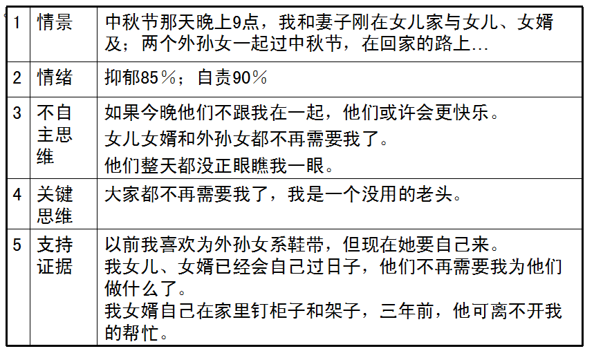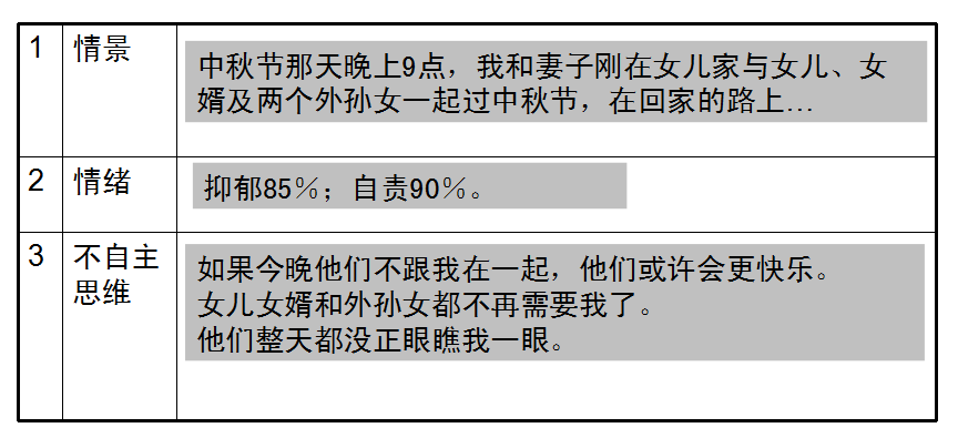 在张先生完全看懂了H女士所填写的表格之后,心理医生要求他尽量回忆最近一次情绪低落的情景,并参照H女士的方法填写表格。结果,张先生想起了中秋节晚上……