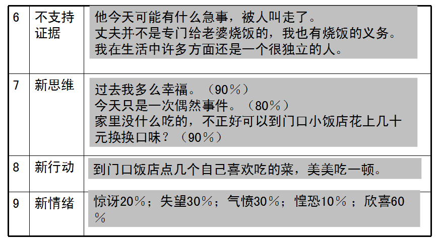 显然,张先生一时难以理解和掌握心理医生提供的这么多内容。于是,心理医生又从抽屉里拿出了一份别人完成的作业,并且对张先生说,这就是我们上次所提到的H女士在专家的指导下、所完成的思维范式的转换。