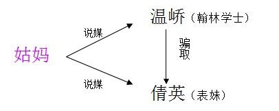 温公丧妇,从姑刘氏家值乱离散,唯有一女甚有姿慧,姑以属公觅婚。公密有自婚意,答云:“佳婿难得,但如峤比云何?”姑云:“丧败之余,乞粗存活,便足慰吾余年,何敢希汝比。”却后少日,公报姑云:“已觅得婚处。门地粗可,婿身名宦,尽不减峤。”因下玉镜台一枚,姑大喜。既婚交礼,女以手披纱扇,抚掌大笑曰:“我固疑是老奴,果如所卜。”( 《世说新语·假谲》 )