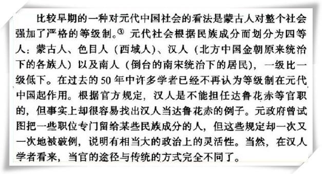 ①任用官吏方面。从中央到地方各级官署的实权多数操在蒙古人、色目人手中。元统治者尤严防汉人掌握军机重务,定制汉人不得阅军数,故掌兵权之枢密院长官(知院)终元一代除少数色目人外皆为蒙古大臣,无一汉人。仁宗延祐元年(1314)恢复科举取士,但在名额分配上表现极大的不平等。考试程式,蒙古、色目人考二场,汉人、南人需考三场;考题难易也有差别。