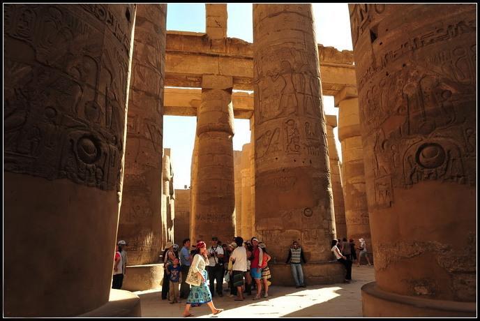 通过公羊大道,是一座宏伟城门,门前立着八米高的拉美西斯二世的石雕,他的两腿之间镌刻着王后的雕像,一大一小,和谐地融为一体。面积为6000平方米的石柱大厅,共排列着134根巨大石柱,中间的两排柱子最为粗大,重达12吨。