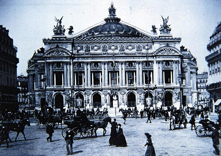 巴黎歌剧院是建筑师加尼埃设计的,1862年开工,1874年完工,完工时拿破仑三世已经倒台,加尼埃为他专门设计的皇帝专用入口已不再需要。在风格上巴黎歌剧院属于折中主义建筑,是法国古典风格和意大利巴洛克风格的完美结合。歌剧院立面有一排双柱,左右各有一个亭阁,其间点缀了大量花饰和雕像。歌剧院内的观众大厅富丽堂皇,装饰了各种颜色的大理石。门厅和休息厅布满了巴洛克式的雕刻、吊灯和绘画,墙壁上四处可见金色的镶嵌图案,目的就是要创造一种金碧辉煌的氛围。