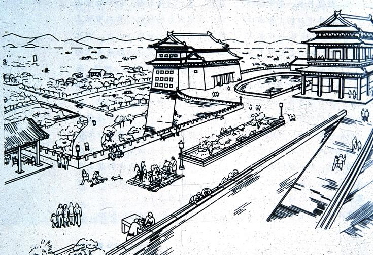 明灭元后大都改名北平,到明成祖朱棣时都城从南京迁到北平,改称北京,南京则成为陪都。明代北京城是在元大都的基础上建成的,平面仍为不规则的方形。在城四郊分别建了天坛(南)、地坛(北)、日坛(东)、月坛(西),是帝王按方位祭祀天地日月的地方。明中叶以后,在城市南郊发展出了新的商业区。于是在这里修城墙,扩大城区,是为外城,而原有的城区就成了内城。这时北京城的整体平面就像个凸字形,原在城外的天坛被围在了外城内。