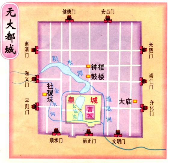 元大都是以宫城、皇城为中心布置的。因为这里地势平坦,又是新建,所以城市的道路规整平直,成方格状。城的轮廓接近方形。全城道路分干道和胡同(小巷)两类,干道宽阔,胡同狭窄。在胡同之间建造住宅,每幢住宅的占地面积规定为八亩,这就逐渐形成了北京独具特色的民居四合院。大都城中心建造钟楼和鼓楼,皇城偏于城南。全城有宫城、皇城、都城三重城墙,城门1l座。元末在皇城外又修了瓮城,瓮城门洞砌成砖拱,以防火攻。