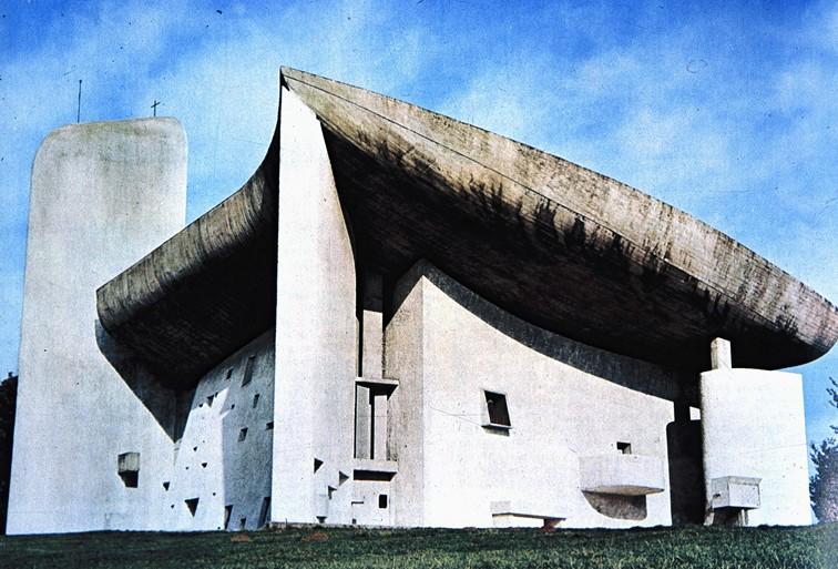 法国东部孚日山区有个叫朗香的小山村,教堂就建在这个村子的一座小山顶上。柯布西耶设计的教堂很小,连坐带站只能容纳200人。他为这个小教堂设计了一个奇特的外形,墙体几乎全部弯曲,有一面还是倾斜的,上面有一些大小不一、形状各异的窗洞。朗香教堂有个大屋顶,用两层钢筋混凝土薄板构成,在边沿处两层回合后向上翻起,模样像一艘轮船。教堂内光线幽暗,阳光透过一道墙缝射进来。它外形的曲折歪扭程度超平人们的想象之外。柯布西耶解释说,他是把这座教堂当作一个听觉器官来设计,以便上帝听到信徒的祈祷。这说明朗香教堂是一个象征性建筑,也透露出柯布西耶这时在建筑设计时已带有明显的浪漫主义和神秘主义成分。1953年教堂落成,从山下遥望它,形如迎风的满帆,似乎在引导信徒们来到一个精神的避风港。