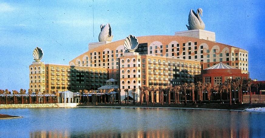 在20世纪90年代格雷夫斯还为迪斯尼乐园设计了天鹅饭店。这家建在湖边的饭店被涂成橘红色,色彩斑斓的倒影映在碧水如镜的湖中,充满了迪斯尼乐园的奇幻色彩。