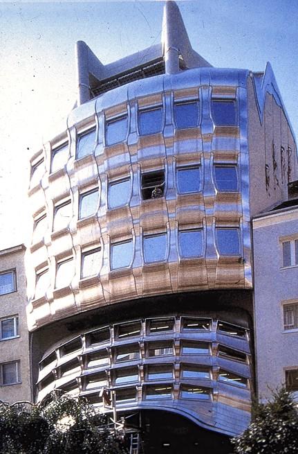 第三,怪诞手法。有些后现代建筑师认为,压制古怪、荒诞的设计不利于建筑创新,要恢复建筑的生机就要允许探索怪诞的手法。1980年在奥地利首都维也纳建的詹特拉斯帕卡斯大楼是家银行的办公楼,它的外观很古怪,金属外壳凹凸不平,里面的楼梯好像管道在蜿蜒曲折的墙壁上爬行。仔细看大楼正面又像一张突额大嘴,仿佛是在警告,如果你入不敷出,银行会把你一口吞掉。