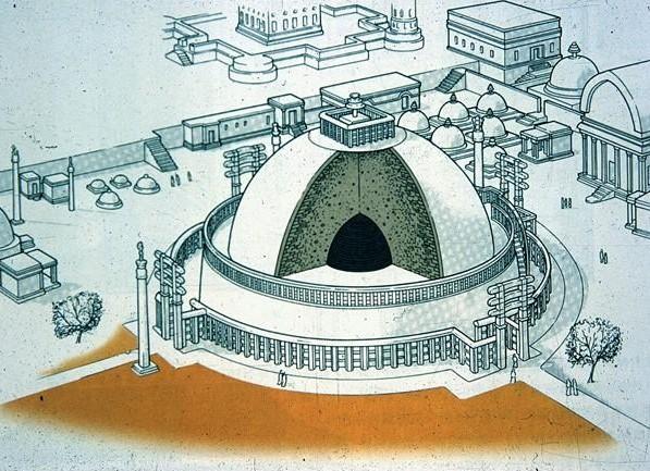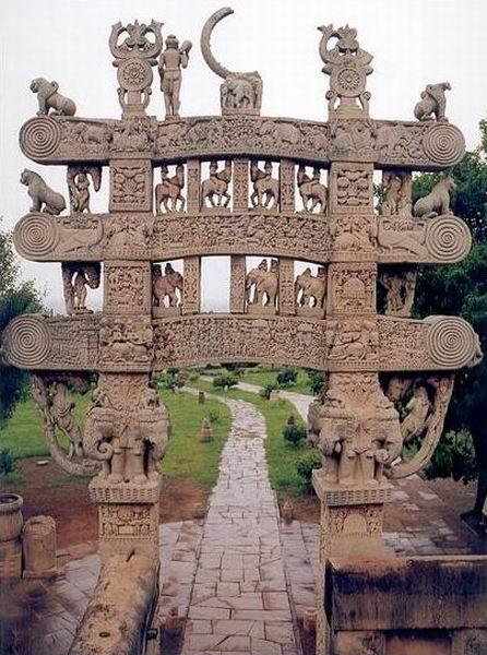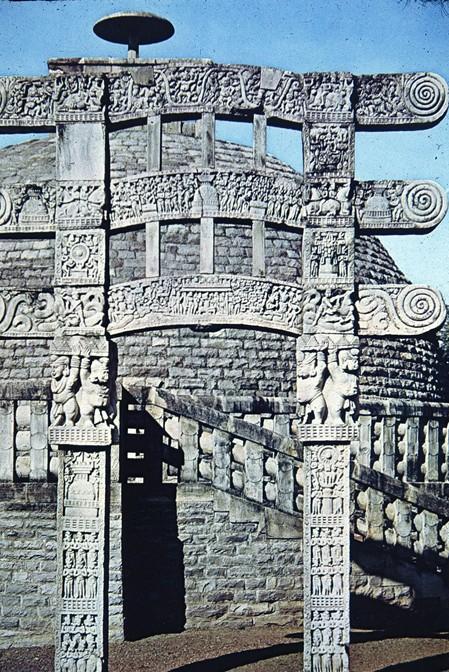 桑奇大塔,它始建于公元前250年的阿育王时代, 后经翼伽王朝和安达罗王朝扩建,直径由20m扩大到36.6m,覆钵覆以石材,增设了基座和围栏,并在4个入口处加建了雕刻精美的塔门—“陀兰那”(Tonana)。整个大塔主体由基座、半球形的“安荼”(Anda,又称覆钵)、球顶藏设圣骨的四方体 (Harmika,又称宝匣),以及最顶部的三层伞盖(Umbrella,又称相轮)构成。尽管上述各部分还有更丰富的象征意义,但塔顶的竖轴和整体的轴心对称形式无疑表明:中心的象征是凌驾于其他意义之上的。所以,在扩建时由于直径的增大,遇到四座塔门与原有南北轴上的阿育王石柱(现已残断)冲突时,宁可使整个大塔作了顺时针的略微偏转,也没有破坏原有十字型构成的中心完整性。