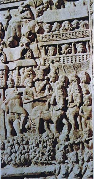 如《须大拿太子本生》在同一幅浮雕中反复多次出现太子一家的形象,通过人物动作和背景的变化表现故事情节的发展;《出家逾城》则通过同一幅浮雕中反复出现 5次的同一匹空马在不同背景衬托下前后高低位置的移动,像动画片一样在空间的运动中表现了时间的推移和情节的转换。桑奇浮雕的透视,除了采用帕鲁德的平面式透视之外,还采用了以远方人物的足跟表示地面的阶层式透视。此外,桑奇南门第3道横梁背面的《分舍利战争》和东门第 3道横梁正面的《阿育王参拜佛陀伽耶精舍》等浮雕,不仅具有艺术审美价值,而且具有历史文献价值。
