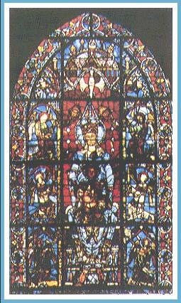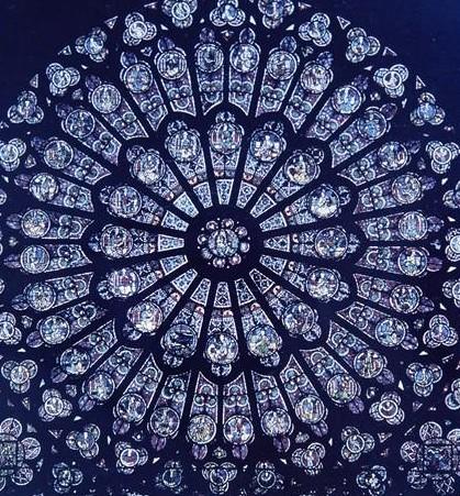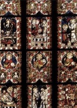 三、所有狭长的窗户以彩色玻璃作镶嵌,使室内光线炫目,增强教堂的神秘感。人在宽长的主殿前,面对金绣银缀的祭坛,烛光前的受难耶稣像,仰望高耸的飞券肋拱,它们象一簇簇飞箭,集中在屋顶,使人顿觉有升腾之感。沙特尔教堂就以其华丽的彩色玻璃窗和装饰雕刻为最富特色。这扇玻璃窗就在教堂南侧唱诗席一面的墙上。