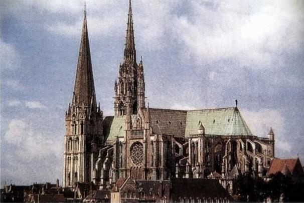 沙特尔教堂原是公元9世纪时建的罗马式教堂,在毁于大火后于13世纪重建。从外部看它有两个风格迥异的塔楼,明显的不对称。这是因为建造教堂的时间很长,双塔出自不同设计师之手,而造成了前后风格的不统一。