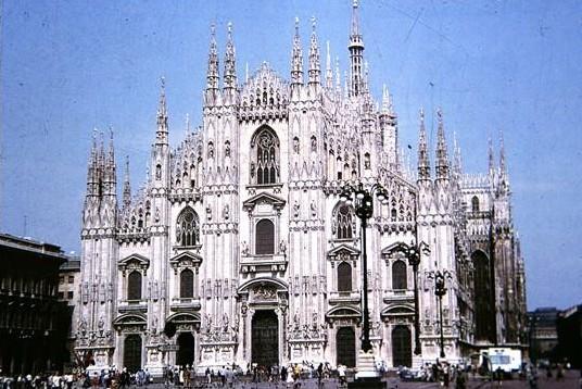 意大利米兰大教堂是欧洲中世纪最大的教堂,可供4万人举行宗教活动。它始建于公元1386年,到公元1485年才完成。这座教堂全由白色大理石筑成,大厅宽达59米,长130米,中间拱顶最高45米。教堂的特点在它的外形。尖拱、壁柱、花窗棂,有135个尖塔,像浓密的塔林刺向天空,并且在每个塔尖上有神的雕像。教堂的外部总共有2000多个雕像,甚为奇特。如果连内部雕像总共有6000多个雕像,是世界上雕像最多的哥特式教堂。因此教堂建筑格外显得华丽热闹,具有世俗气氛。这个教堂有一个高达107米的尖塔,出于公元15世纪意大利建筑巨匠伯鲁诺列斯基之手。塔顶上有圣母玛利亚雕像,金色,在阳光下显得光辉夺目,神奇而又壮丽。