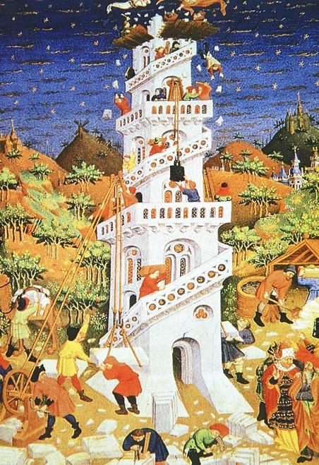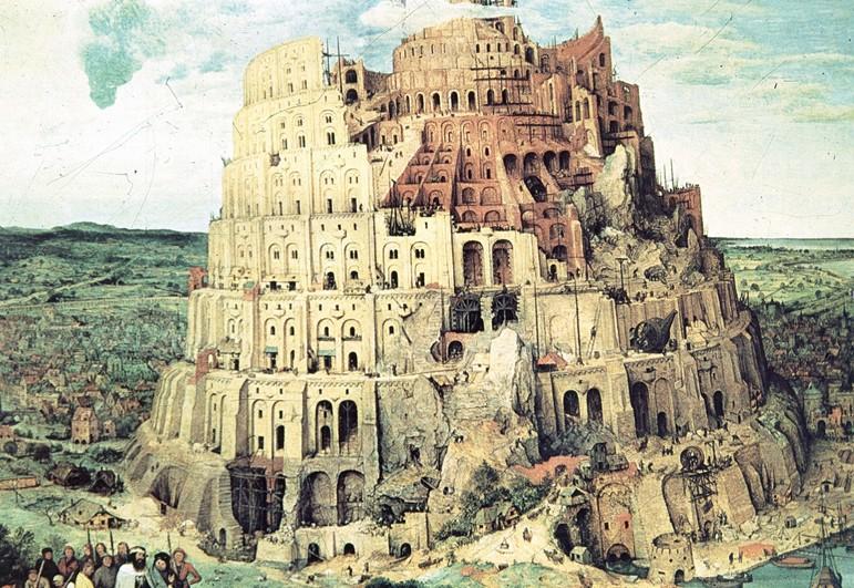在《圣经·旧约》中有这样一个故事:古时候天下的人都说一种语言,挪亚的后人在向东迁移时走到一个叫示拿的地方,发现一片平原,就住了下来。他们计划修建一座高塔,塔顶要高耸入云,直达天庭,以显示人们的力量和团结。人们很快就开始建塔,这件事惊动了天庭的耶和华神。他见到塔越建越高,暗自思忖,现在天下的人都是一个民族,都说一种语言,他们团结一致,什么奇迹都可以创造,那神还怎么统治人类?于是耶和华便施魔法,变乱了人们的口音,使他们无法沟通,高塔也无法继续建下去,最终没有建成。