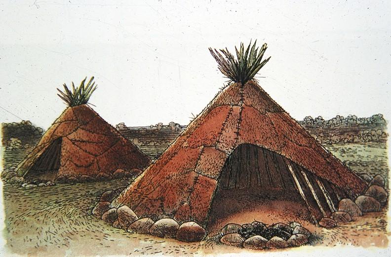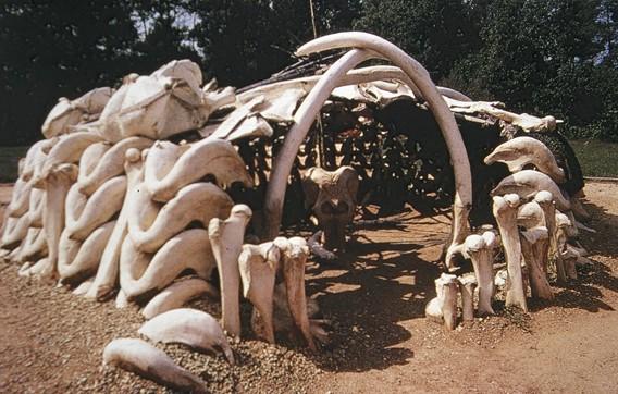 原始民族建房造屋都会注意利用当地的建筑材料,使他的房屋适应所处的自然环境。比如居住在北极地区的因纽特人会用冰块建造冰屋,以适应极地气候。而居住在北非沙漠中的阿拉伯人,自然就会住在帐篷中。在乌克兰的平原上,曾出现过用猛犸骨架构的房屋,则是因为在远古时期这里是猛犸生活的乐园,后来猛犸灭绝了,它们留下的尸骸就成了特殊的建筑材料。在基辅附近的梅日里奇,发现了一个有15000年历史的古村落遗址,这个村落现存的五间房子全是用猛犸骨建的。最大的腿骨被用来建造承重墙,搭成人字形,较小的骨头则排列在承重墙上,构成墙壁的上半部,屋面铺猛犸皮。