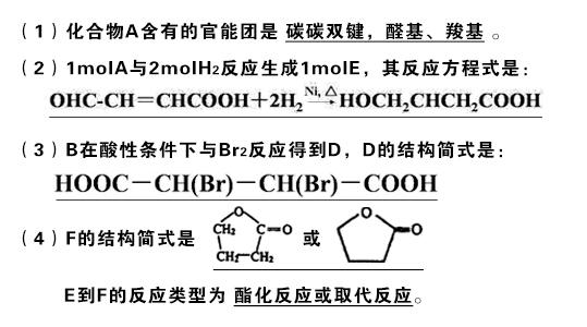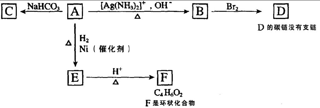 溶液反应,说明有羧基“—COOH”;能发生银镜反应,说明有醛基“—CHO”;氧化得到的B可以与Br2加成,说明A还有碳碳双键“C=C”。框图中没有直接给出A的分子式,可通过F的分子式反推,由于A→F没有碳原子增加的反应,故A含有4个C原子。