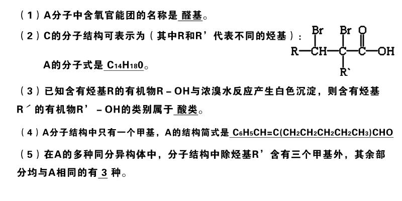 A的结构由题中C的结构反推,即断新建复原旧键,可得R—CH=C(Rˊ)—CHO。进一步需要解决的是2个烃基(R、Rˊ)的组成和结构。根据信息点“R-OH与浓溴水反应产生白色沉淀”,这是苯酚具有的性质,可推知“—R”为苯基“—