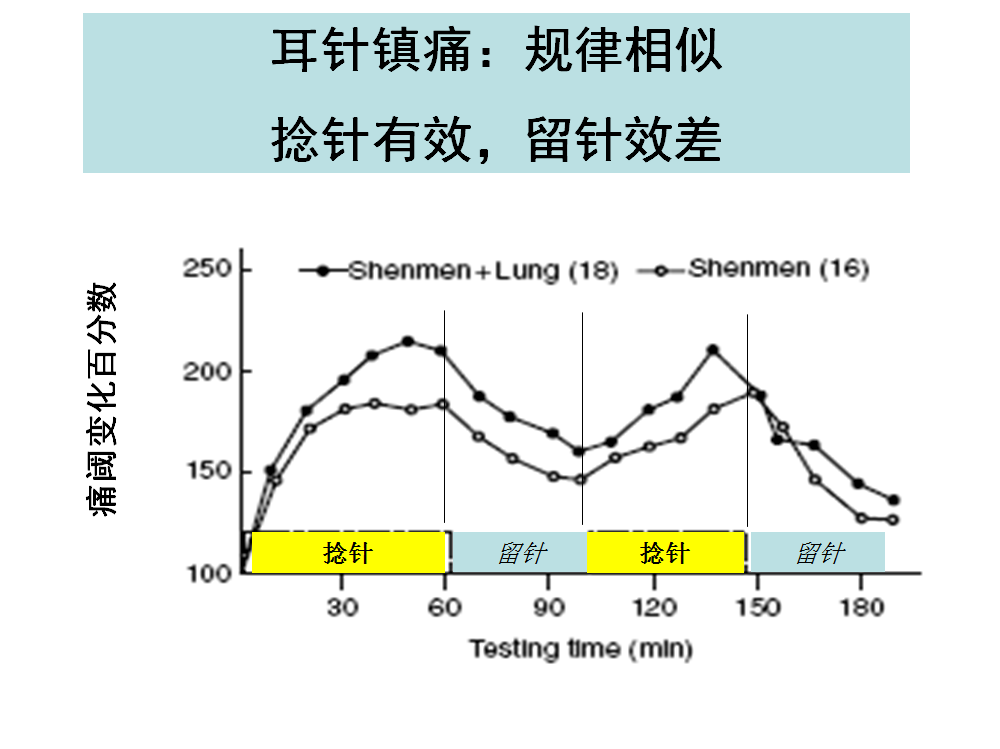针刺对近神经节段区域的镇痛效应:根据近几十年的研究,用较弱的手针或电针刺激穴位,常在局部观察到镇痛和痛阈升高的现象,这种镇痛效应在脊髓动物也能观察到,也就是说,脊髓的整合机制主要在“近节段取穴”时参与镇痛作用。近节段的针刺镇痛效应在刺激强度稍低,仅激活粗的传入纤维情况下就可产生良好的镇痛效应,这种效应在脊髓水平就可完成,在“闸门控制”系统下发挥作用。闸门控制的核心部位在脊髓的胶质区,它可被粗纤维的传入活动兴奋,并产生负的背根电位。针刺引起的节段性效应与闸门控制系统的关系已经基本得到证实。
