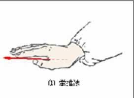 掌推法:以掌根部着力于施术部位,腕关节背伸,肘关节伸直。以肩关节为支点,上臂部主动施力,通过前臂,腕关节,使掌根部向前做单向直线推进。