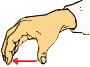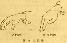 指推法:以拇指端着力于施术部位或穴位上,余四指置于对侧或相应的位置以固定助力,腕关节略屈并偏向尺侧。拇指及腕臂部主动施力,向拇指端方向呈短距离单向直线推进。