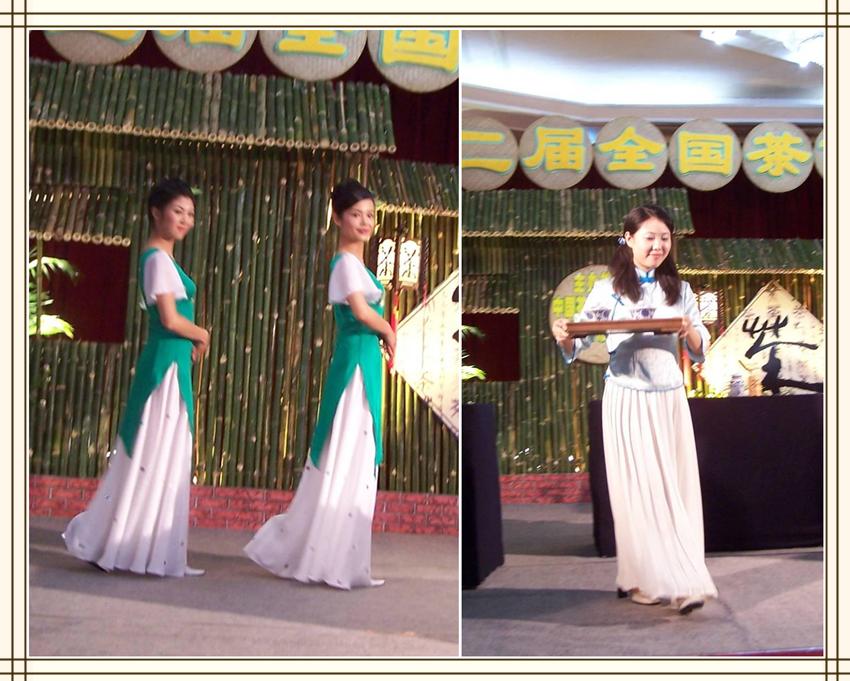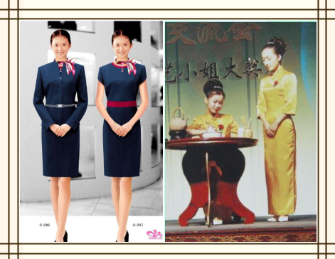 无论哪一种坐姿,都要自然放松,面带微笑。优雅的坐姿对茶艺服务人员来讲,真是太重要了。一般在做茶艺表演时,较多的是坐着冲泡操作的,遗憾的是在很多出版的茶艺表演图片中,有的茶艺服务人员双膝分开,非常不雅观;有的茶艺服务人员提壶时,肩膀一边高一边低,也是不好看的;有的下巴没收,感觉脊梁不挺;有的凳子太低,桌子太高,看不出美感;有的身体离桌子太近,显得很不自然。甚至在参加一些国际性的茶艺表演时也有类似情况,如茶艺服务人员在高处或舞台上表演,敞开膝盖及腿,显得很不礼貌。