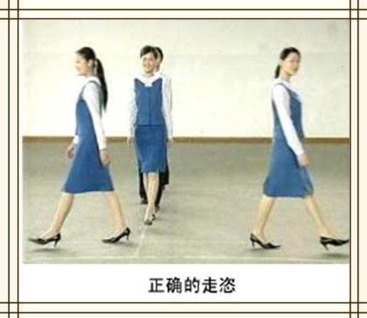 着长裙的走姿:着长裙使人显得修长,穿长裙走路要平稳,步幅可稍大些,转动时注意头和身体协调配合,尽量不使头快速地左右转动。走动时可一手提裙。