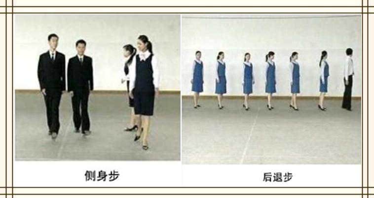 后退步:向他人告辞时,应先向后退两三步,再转身离去。退步时,腿要轻擦地面,不可高抬小腿,后退的步幅要小。转体时要先转身体,头稍候再转。
