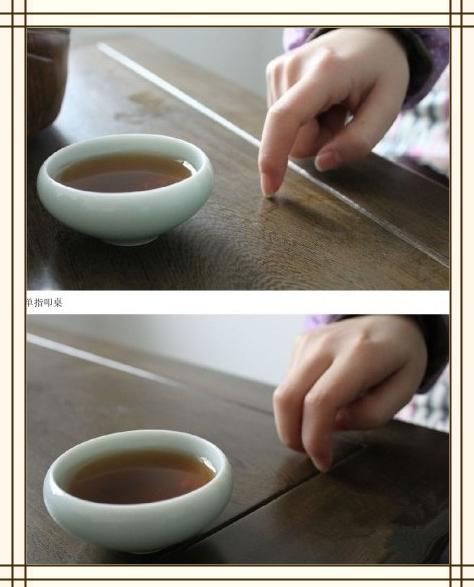 叩手礼即用食指和中指轻叩桌面,以致谢意。在长辈或上级给晚辈或下级斟茶时,晚辈或下级必须用双手指跪拜状轻轻叩击桌面两三下;晚辈或下级给长辈或上级斟茶时,长辈或上级只需用单指叩击桌面两三下表示谢意。