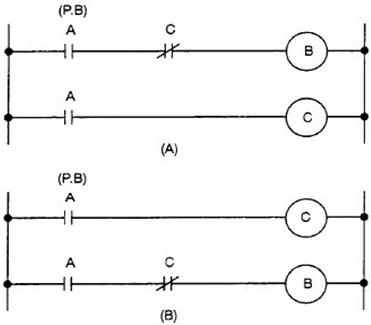 继电器回路(A)和(B)的动作相同。接通A(按钮开关)后线圈B和C中有电流通过,C接通后B断开。
