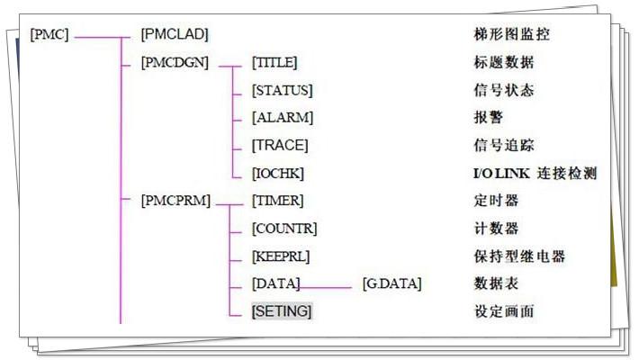 FANUC系统为方便维修人员进行故障诊断,开发了:PMC诊断界面、伺服诊断界面、主轴诊断界面、NC诊断界面。这些诊断工具为分析、查找故障点提供了方便。FANUC i系列在PMC菜单下面提供了:梯形图和信号状态诊断界面。PMC状态菜单:可以进行信号跟踪和信号强制