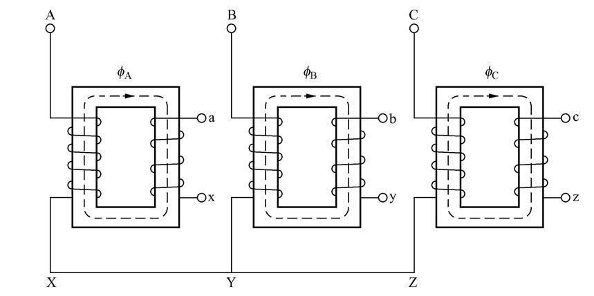 三相变压器的电压和电流基本上是对称的。对称的三相电压或电流大小相等,相位互差120 o,可取三相中的一相来分析计算,即将三相问题简化成单相问题。
