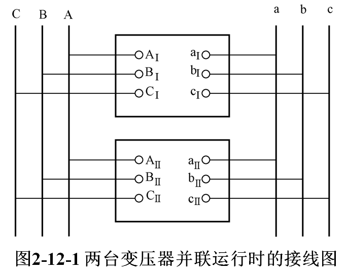 变压器的并联运行,是指将两台或多台变压器的一次绕组和二次绕组分别接到各自的公共母线上,共同向负载供电,如图2-12-1所示。