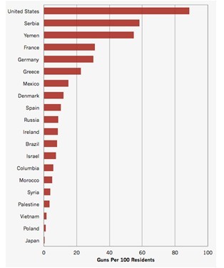at around 0.89, than any other nation in the world. The U.S. has over 50% more firearms per capita than the next two highest nations, Serbia and Yemen at about 0.55 and three times as many as major European countries such as France and Germany.