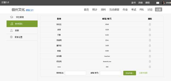 泛雅平台允许教师之间形成团队,共同建设课程。点击左侧标题栏“教师团队”,即可进入教师团队设置。教师可以选择手动添加共建人,即通过输入教师姓名和邮箱等信息添加教师进入团队。也可以从点击从库中选择,在数据库中通过院系,姓名等信息进行教师的筛选,以加入教师团队。