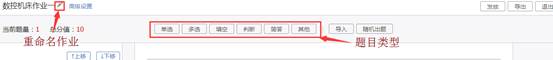 点击新建后,设置作业标题,之后进入作业编辑界面。在作业编辑界面也可重命名作业。教师可以选择手动编辑,即在编辑页面直接编辑作业。上方菜单栏有“单选”、“多选”、“填空”、“判断”、“简答”和“其他”集中题型供教师选择。