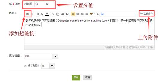 点击不同的题型可以编辑试题,选择好题型后,教师可设置题目的分值,编辑题目内容以及答案。可根据需要设置内容的字体等信息,添加超链接和上传附件。