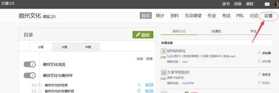 进入课程后,点击右上角功能导航菜单的“设置”选项,进入设置界面。