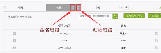 学生管理界面的最上方,即班级管理,点击要设置的班级,即会在班级名后出现两个按钮,分别为重命名班级以及归档班级。归档后的班级可留作保存用或被删除,不会再出现在此界面上。可通过“查看已归档班级”进行操作。