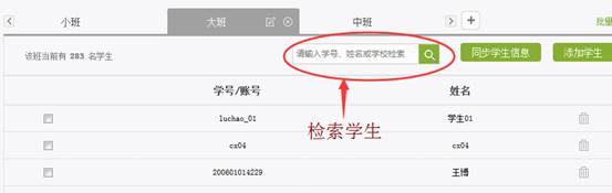 教师选择好班级后,可通过输入学号或姓名等信息检索已经被添加到班级中的学生。