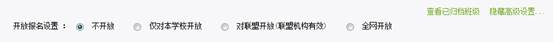 报名设置中,“不开放”即不开放该课程,学生的学习空间中没有选择该门课程的按钮。选择“仅对本校开放”则只有本校学生可以报名该课程。“对联盟开放”即加入了泛雅慕课联盟的学校可选择,选择后联盟内学生都可报名。“全网开放”即网络内所有学生都可以报名该课程。