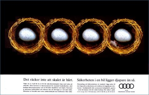 奥迪汽车的招贴广告摒弃传统的汽车广告机械性和正面表述的表现形式,巧妙地利用四环标志和鸟窝的联想,把鸟窝对蛋的保护和奥迪汽车对人的保护相类比,进而传达汽车安全可靠的广告意境。