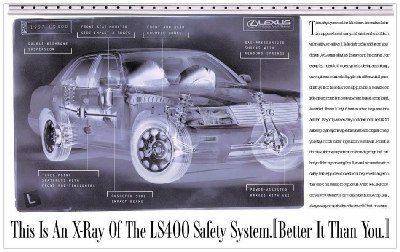 上图利用聚合思维的求同特性从正面和人们使用x光进行身体检查进行类比,直接表现汽车质量的优异。