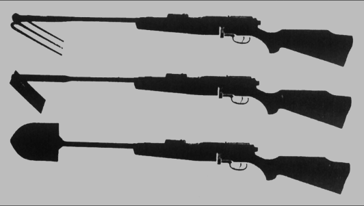 这是一幅反战的海报,主体是三把并排放置的步枪,巧妙的是枪口部分被换置成三种不同的劳动工具。表达一种停止战争,恢复生产的愿望。