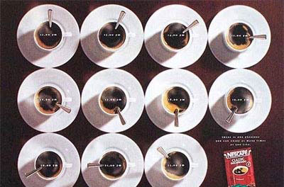 雀巢咖啡的招贴广告采用变异的构成方式,它不是在直接介绍雀巢咖啡的优良品质,而是巧妙地利用勺子的角度表现雀巢咖啡深入人们生活的每时每刻,与你密切相伴的广告意境。受到生活中的激发。