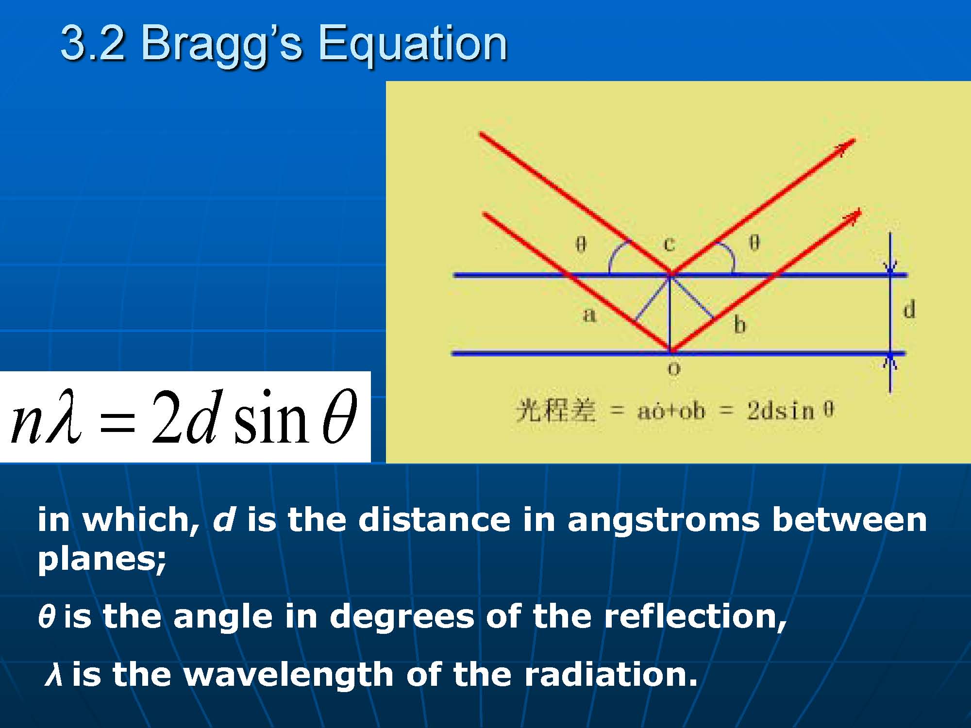 n上式称布拉格定律或布拉格方程,式中d为晶面间距;θ为入射线、反射线与反射晶面之间内夹角,称掠射角或布拉格角,而2θ为入射线与反射线(衍射线)之间的夹角,称衍射角;n为整数,称反射级数;λ为入射线波长。