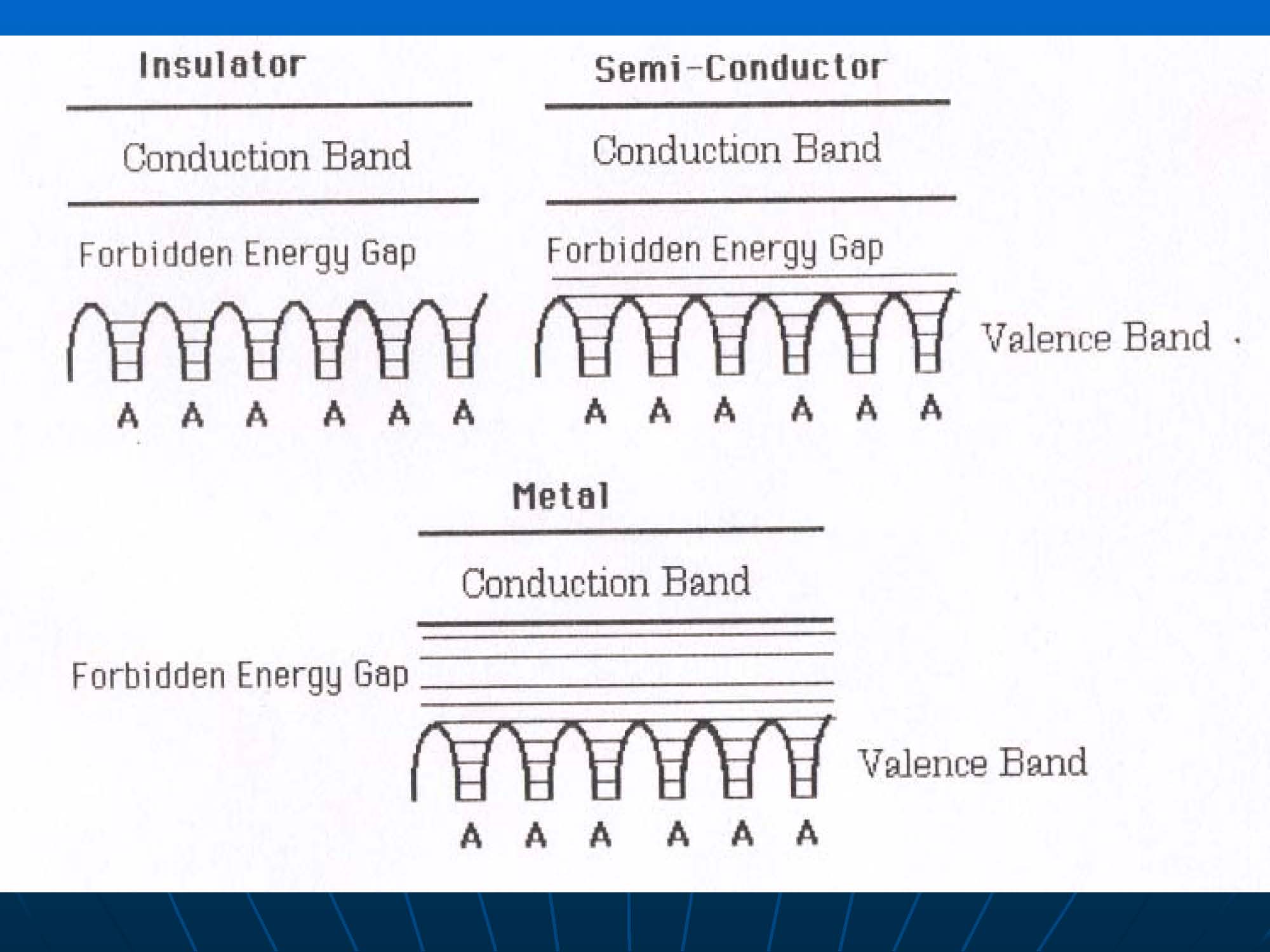 ②区和区之间能量是不连续的,这个区域称为禁带(forbidden band),禁带宽度的不同可以用来区分导体和绝缘体。